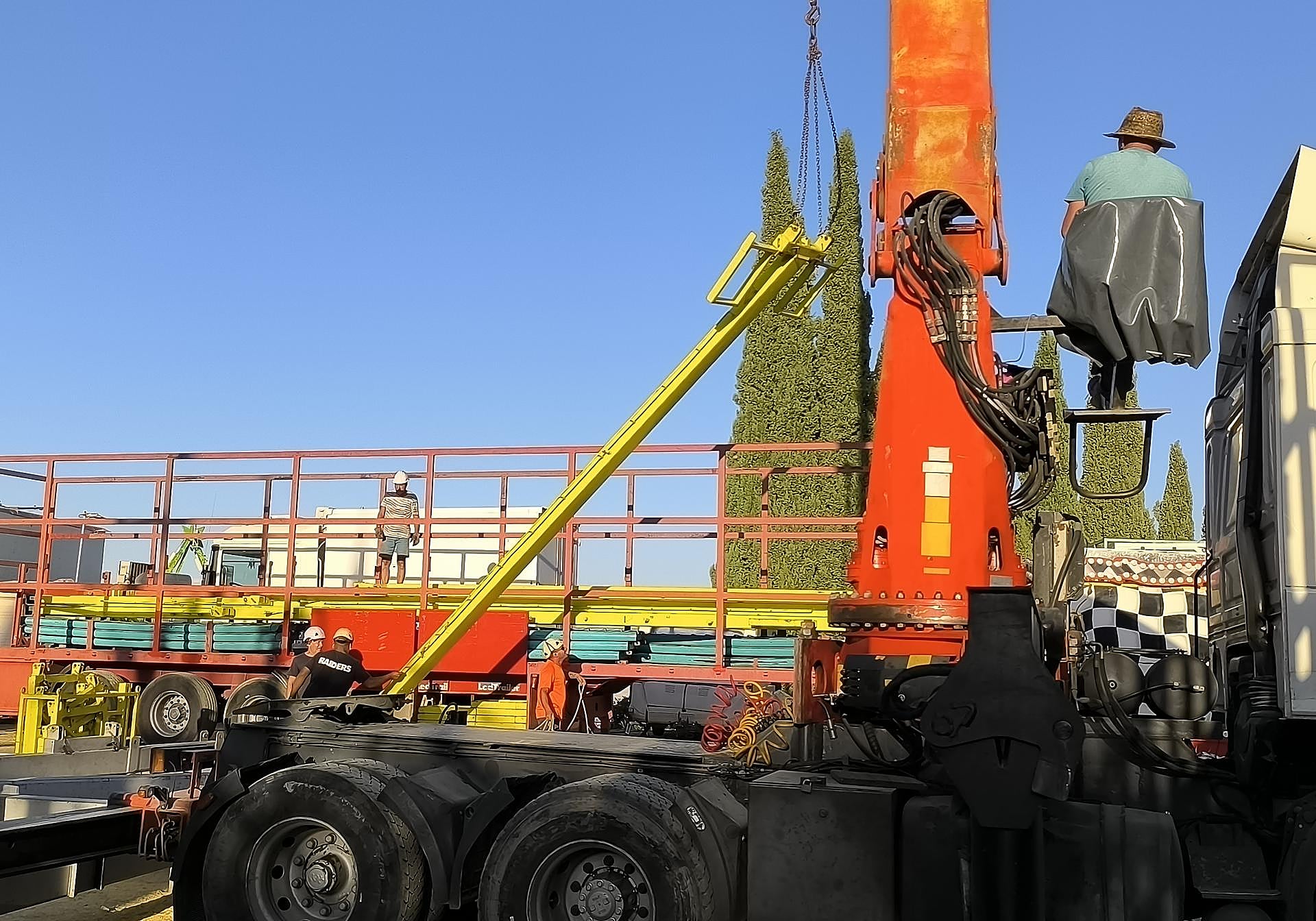 No puede ser una feria sin luces. Los operarios, divididos en varios equipos, se centran estos días en preparar la decoración lumínica utilizando grúas, haciendo frente a las altas temperaturas para esta época del año. «Es un trabajo muy mañoso y hay que tener cuidado, lo mejor es ir despacio y con buena letra», relata uno de los trabajadores.