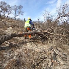 Otra parte importante de los trabajos ha consistido en el desembosque a pie de pista forestal para su posterior aprovechamiento. Los residuos forestales procedentes del desramado de los pies apeados se han utilizado, en lo posible, en cárcavas y pequeños arroyos para frenar la escorrentía y el resto se han eliminado mediante quema y astillado.