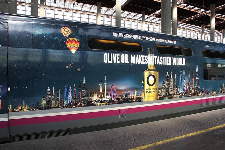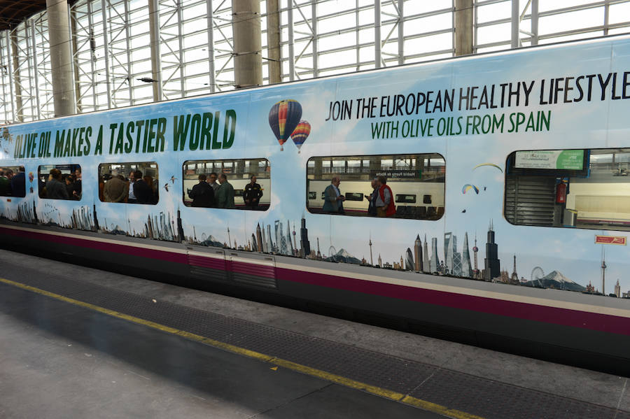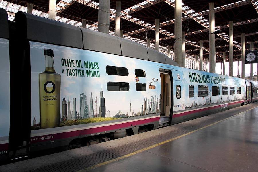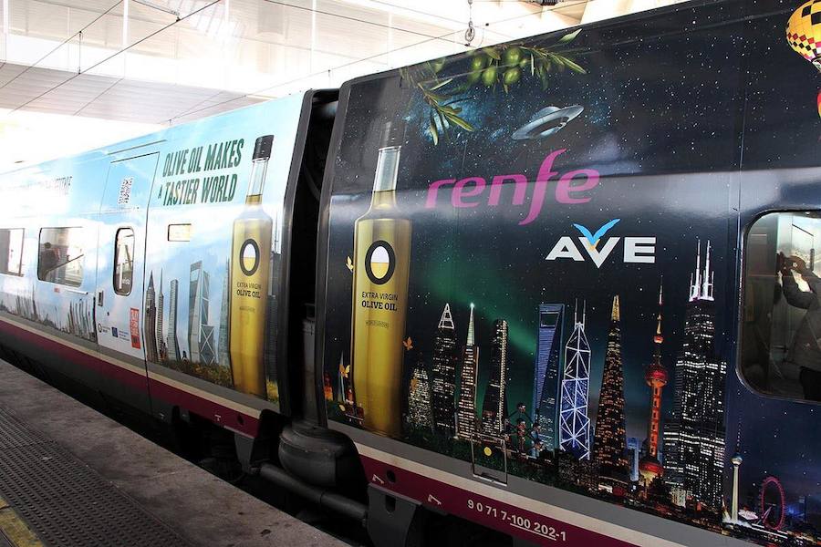 Ahora le ha tocado el turno a Renfe y a un tren AVE que realiza el trayecto Madrid-Sevilla, «vestido» en su exterior con mensajes en inglés e imágenes relacionadas con el «oro verde».