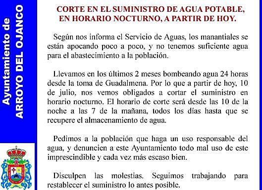 El municipio jienense de Arroyo del Ojanco está registrando cortes nocturnos de agua desde este fin de semana para asegurar la capacidad de abastecimiento a ... su casi 2.300 habitantes después de que en una semana se haya reducido hasta en un 60% el caudal de agua que llega de los manantiales de la zona de Cañana Arada y las bombas que captan agua del embalse del Guadalmena no den abasto para mantener el nivel de recursos hídricos que precisan los depósitos municipales. En un primer momento se apuntó a un corte del agua de 22:00 a 7:00 horas, aunque el Consistorio recortó el horario de restricciones de 00:00 a 6:00 horas.