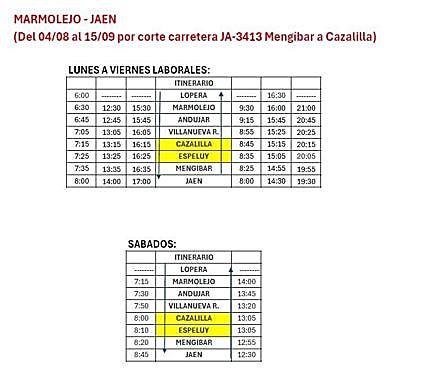 Los sábados, la ruta hacia Jaén incluiría la parada en Cazalilla a las 08:00 y a las 08:10 en Espeluy, mientras que en el trayecto de vuelta pasaría a las 13:05 horas.