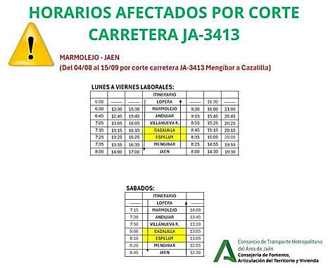 El Consorcio Metropolitano de Transporte ha informado de cambios en la ruta como consecuencia del corte de la carretera JA-3413 entre Mengíbar y Cazalilla, ... en la provincia de Jaén. Los cambios se mantendrán desde este lunes y hasta el 15 de septiembre.