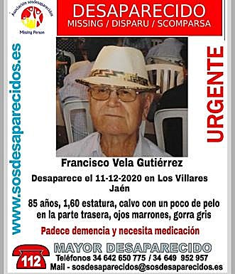 Continúa la búsqueda del desaparecido en Los Villares. Familiares de Francisco Vela Gutiérrez, de 85 años, pedían este viernes la colaboración ciudadana para encontrar al ... hombre en paradero desconocido en las últimas horas. «Salió esta mañana (por ayer viernes) y no ha regresado a casa», señala su hijo, Francisco Vela Ávila, pidiendo que si alguien lo ve se ponga en contacto en el teléfono 647 118 660 o 615 097 175.