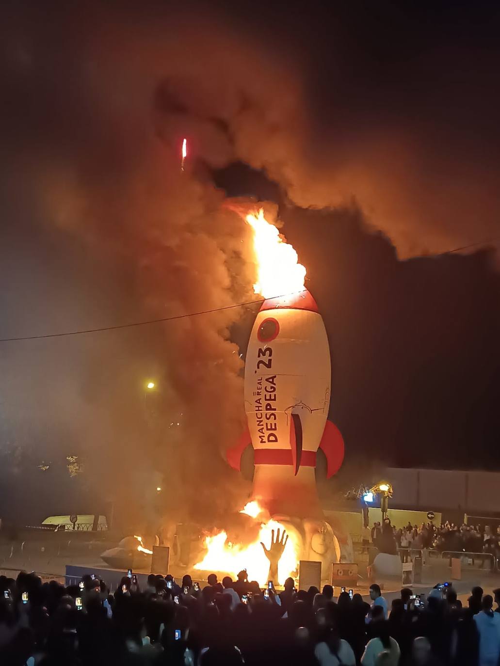 El fuego volvió a ser protagonista en Mancha Real con la tradicional quema de su falla. En esta trigésimo novena edición se trató de un ... cohete con extraterrestres célebres a su alrededor, como ET o Kang y Kodos de Los Simpson, con el título 'Mancha Real despega'. La 'Gran quemá de la XXXIX falla de Mancha Real' comenzó el miércoles con su montaje en el recinto ferial hasta ser consumido este domingo por las llamas.