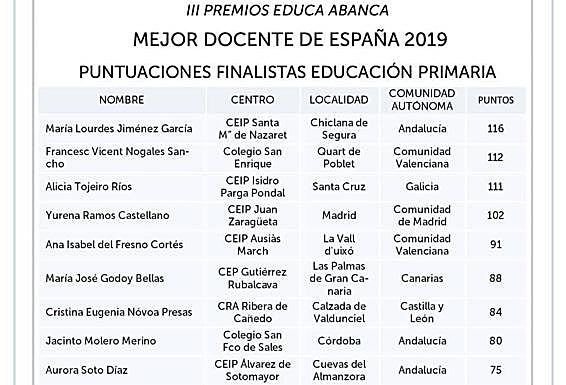 La jienense María Lourdes Jiménez García (Villanueva del Arzobispo, 1986) es la mejor maestra de España. Y no lo dicen sus alumnos, que podrían (tiene ... un 'título' que lo acredita), lo refrenda su primer puesto en el concurso a Mejor Docente de España 2019, los III Premios Educa convocados por Abanca, los 'Goya' de la Educación, en la modalidad de Educación Primaria.