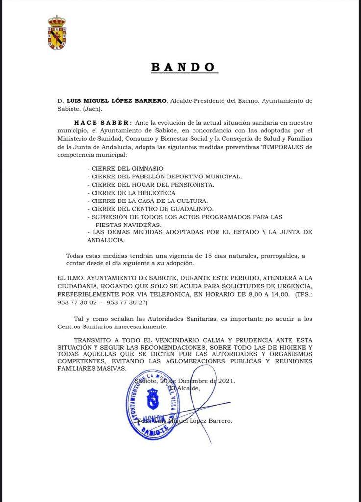 Sabiote, primer municipio jienense sin actividades navideñas por el aumento descontrolado de nuevos casos de covid-19. El alcalde de Sabiote, Luis Miguel López (PSOE), ... ha emitido un bando en el que se comunica el cierre de instalaciones municipales y la supresión de la programación navideña hasta el próximo 4 de enero debido al aumento de los contagios que han llevado al municipio a situarse como el de mayor tasa de incidencia de la provincia de Jaén, con 3.293,9 positivo por cada 100.000 habitantes en los últimos 14 días.