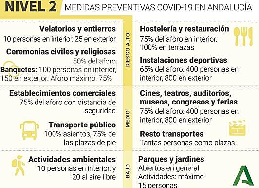 En este nivel los aforos en bares y restaurantes el aforo permitido es del 75% en interior y 100% en terrazas. Para los establecimientos comerciales se fija un 75% del aforo con distancia de seguridad. En cines, teatros y auditorios podrán ocuparse tres de cada cuatro plazas. Las reuniones siguen siendo de cuatro personas en interior y seis en el exterior. Como en el conjunto de Andalucía desde mañana viernes el toque de queda es de 23:00 a 6:00 horas, con bares y comercios hasta las 22:30 horas. La provincia de Jaén está cerrada, sin poder entrar ni salir de ella sin causa justificada hasta el 9 de abril al menos.