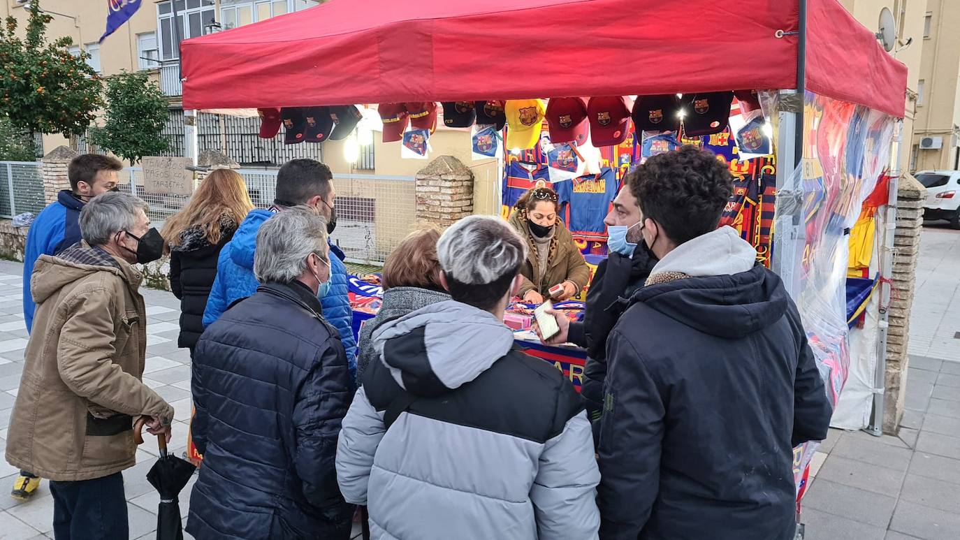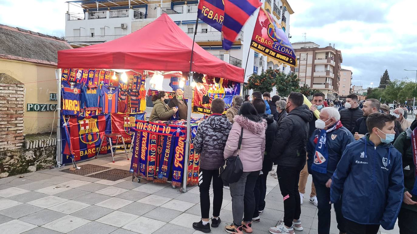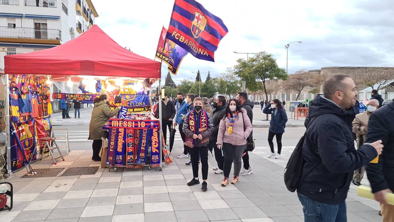 Los puestos de venta de artículos relacionados con los equipos y el partido no paran. El buen tiempo está acompañando por el momento, con la Glorieta de Las Américas como epicentro de los seguidores.