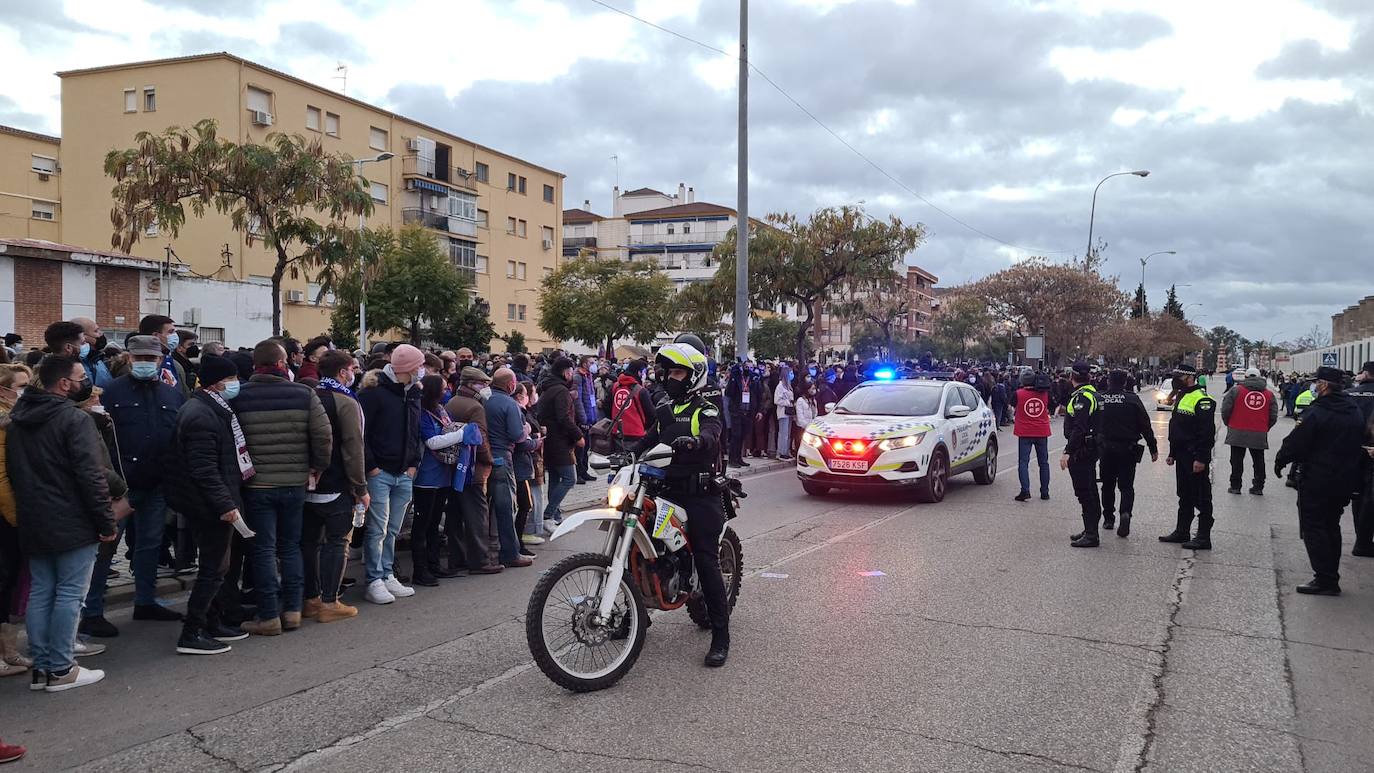 En la Glorieta de Las Américas, junto a la estatua de Andrés Segovia y el mirador del Land Rover Santana, los seguidores se han juntado para recibir a los autocares de los equipos con el tradicional baño de color, banderas y cánticos, para acompañarlos hasta los aledaños de Linarejos.