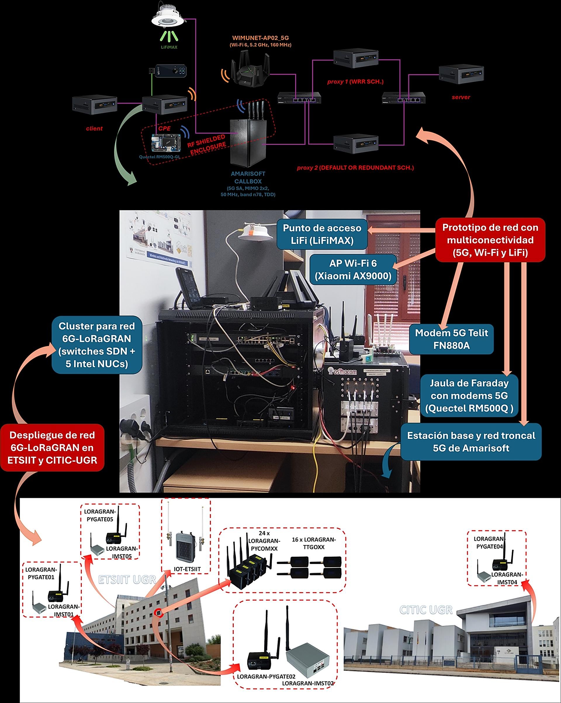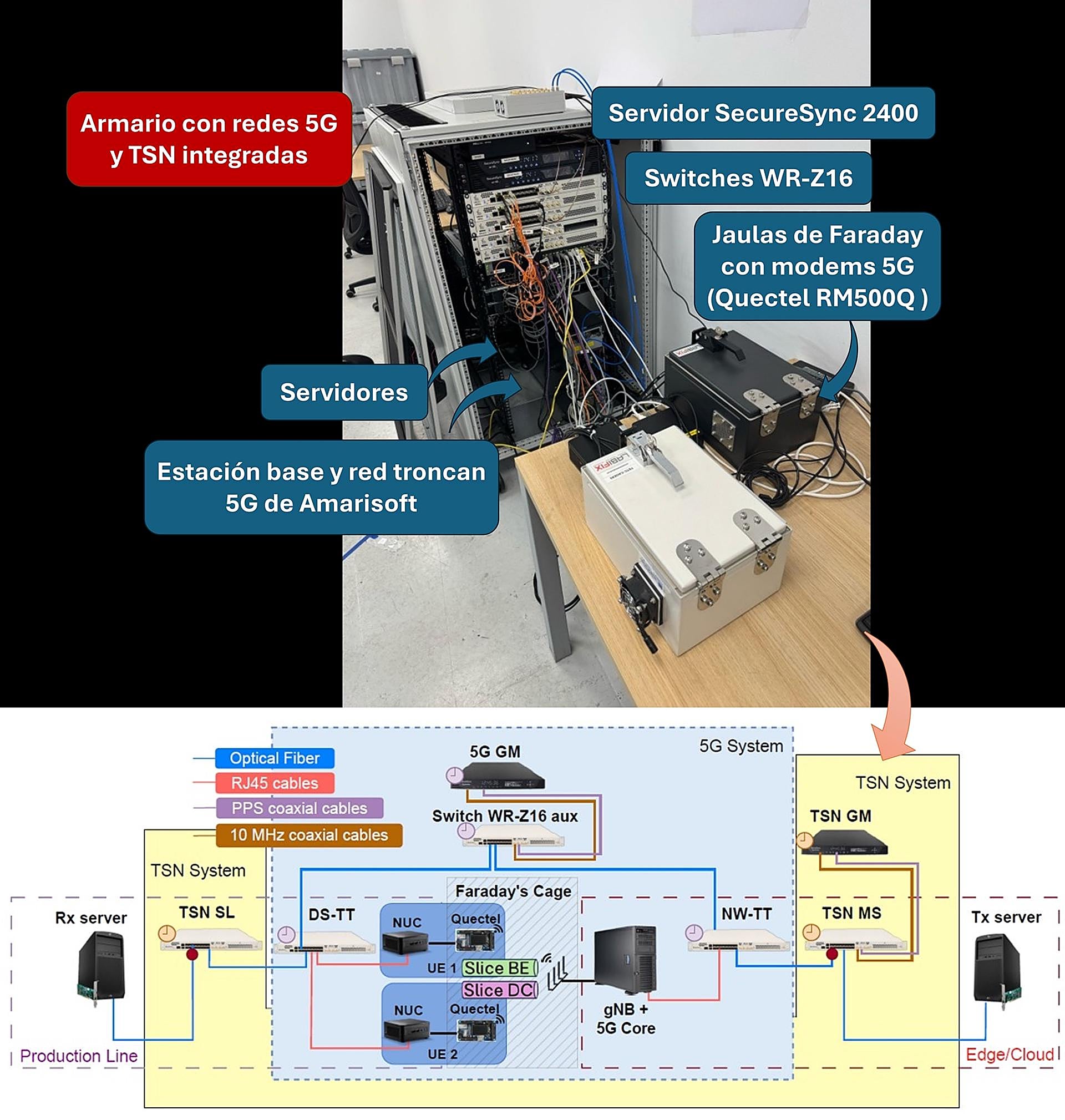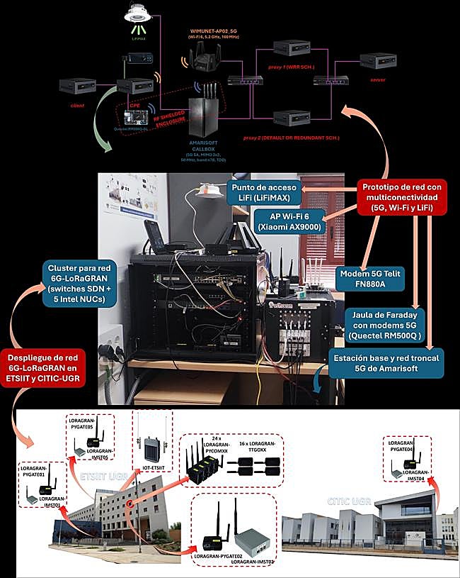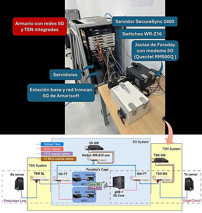 El laboratorio cuenta con una red 5G privada para pruebas en interior y exterior, estaciones base en bandas milimétricas, infraestructura TSN con switches y tarjetas especializadas, y una célula de ensamblaje industrial automatizada que simula procesos reales de fabricación. Además, dispone de robots móviles, brazos robóticos, gafas de realidad extendida, guantes hápticos y una plataforma propia, 6G-LoRaGRAN, que permite experimentación remota y slicing de red en LoRaWAN, conectada con redes 5G de otros centros europeos.