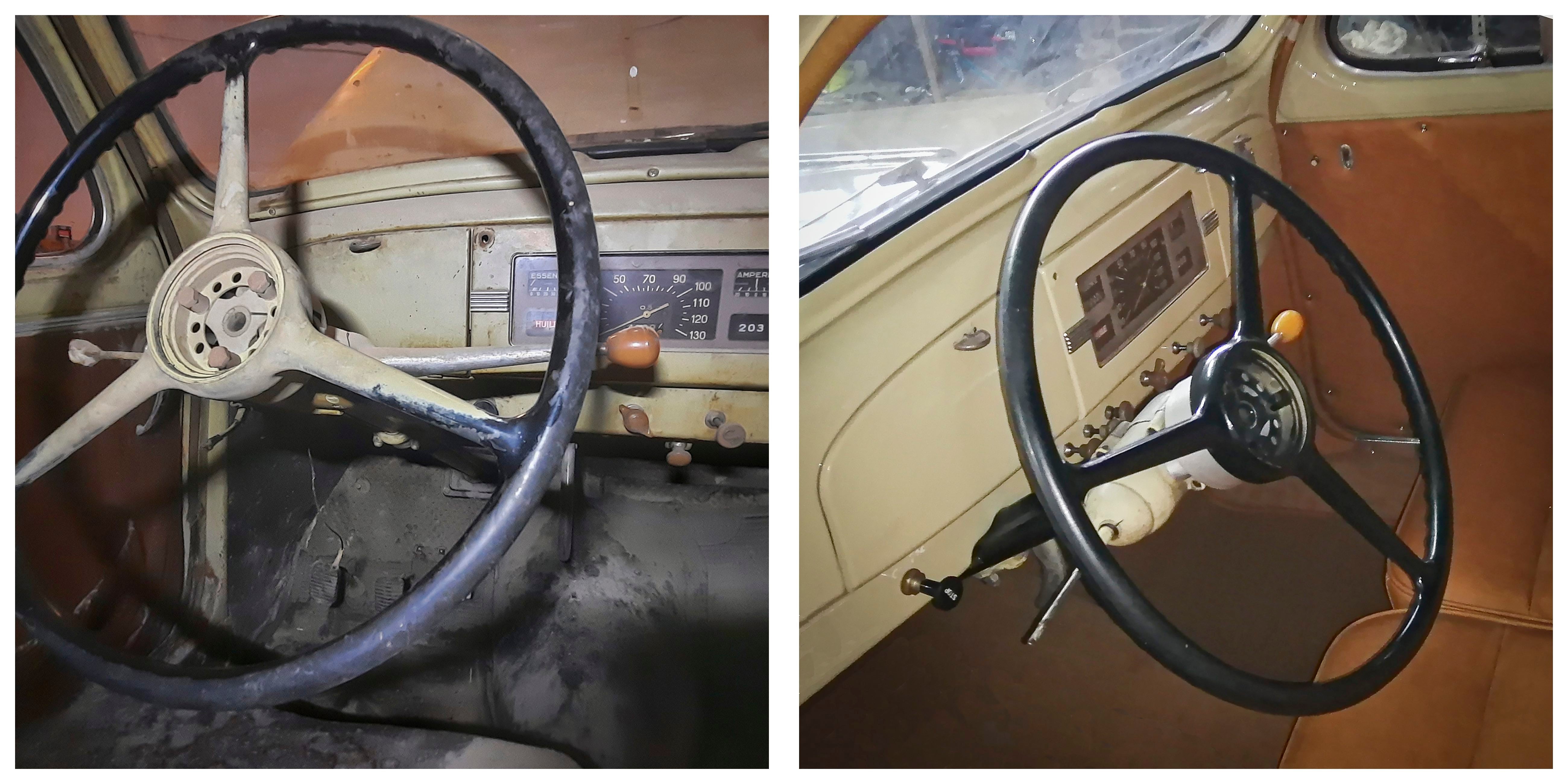 La carrocería, cubierta por una gruesa capa de polvo y suciedad, se encontraba muy oxidada, con pérdidas importantes de chapa —especialmente en el capó, guardabarros, bajos y puertas—, y con la desaparición de elementos originales como la sirena, los intermitentes, el espejo retrovisor, los faros o la insignia, probablemente a causa de actos vandálicos, responsables también de los grafitis presentes en la chapa. El interior no presentaba mejor estado: los revestimientos estaban gravemente dañados por hongos, las tapicerías desgastadas y rotas, los elementos de embellecimiento deteriorados y los neumáticos completamente friables.