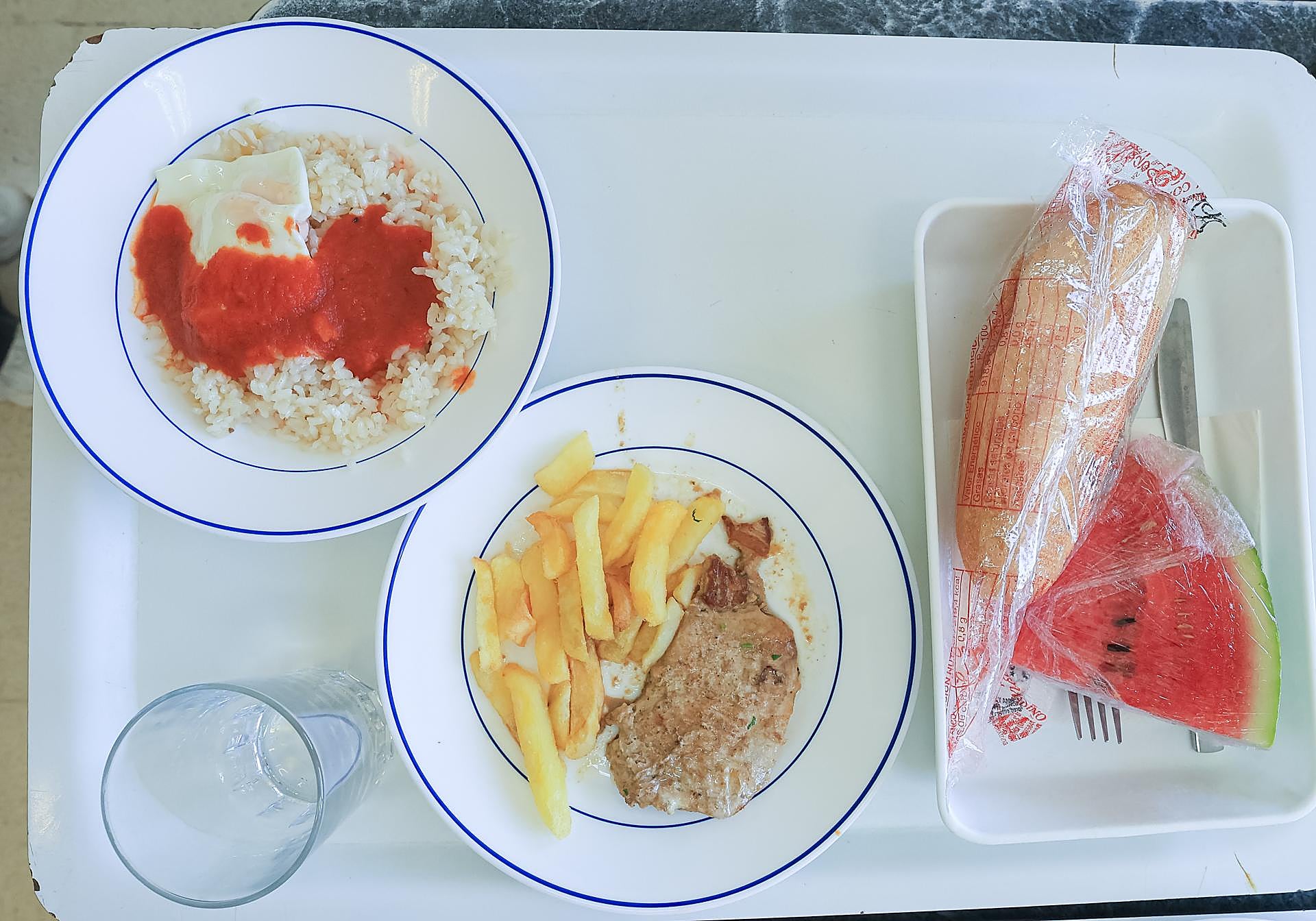 El menú inaugural: un clásico que despierta unanimidad o casi. De primero, arroz a la cubana con huevo frito recién hecho; de segundo, filete de cerdo con patatas que aún humeaban en la bandeja. Para rematar, un trozo de sandía fresca, cortada esa misma mañana en la cocina. Los platos duraban poco más de cinco minutos intactos, porque las cucharas volaban como en un concurso no oficial.