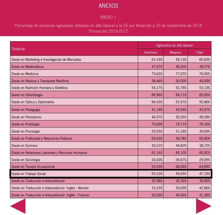 A tenor de estos datos, la decana de la facultad recalca que la cifra de titulados en Trabajo Social afiliados a la Seguridad Social coincide con la obtenida por el área de Ciencias Sociales y Jurídicas y que, atendiendo al sexo, «se observa una mayor feminización en el caso de la tasa de ocupación de Trabajo Social en consonancia con la mayor presencia de mujeres en la carrera».