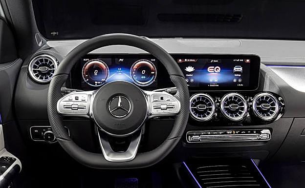 El habitáculo del EQA -casi idéntico al del GLA- incluye numerosos rasgos que acreditan su condición de vehículo eléctrico. En función de la línea de equipamiento elegida, se trata de un elemento de adorno retroiluminado, una primicia en el segmento. Otros detalles exclusivos son los elementos decorativos en color oro rosa en los difusores de ventilación, los asientos y la llave del vehículo. El modelo especial Edition 1 cuenta además con asientos de cuero perforado e instrumentos con visualizadores específicos para la propulsión eléctrica con detalles en azul y en color oro rosa. En el visualizador de medios, puede accederse a los menús con las opciones de carga, el consumo eléctrico y el flujo energético.
