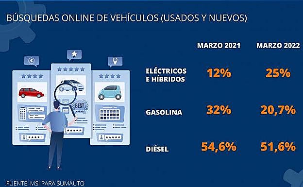 Y lo hacen en detrimento de las búsquedas de los coches de gasolina, que en 12 meses se han desplomado desde el 32% hasta el 21% actual, según datos de Sumauto, especialista en portales verticales de automoción que integra a Autocasión, AutoScout24 y Unoauto, entre otros.