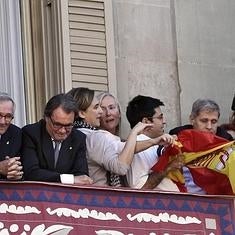 Ha sido entonces cuando Bosch ha colgado una bandera 'estelada' del balcón, acción que ciudadanos congregados en la plaza han acompañado con gritos de "independencia" y que ha provocado una sonrisa en Mas, mientras que Fernández Díaz ha colocado una bandera española.