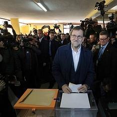 Entre estas 2 imágenes han pasado 38 años de historia democrática en España, se puede leer en este mensaje que se ilustra con dos fotos, la de Adolfo Suárez con su esposa, Amparo Illana, ante las urnas en 1977, las primeras elecciones generales a Cortes tras la dictadura de Franco, y la de Mariano Rajoy, votando esta mañana en su colegio electoral de Madrid.