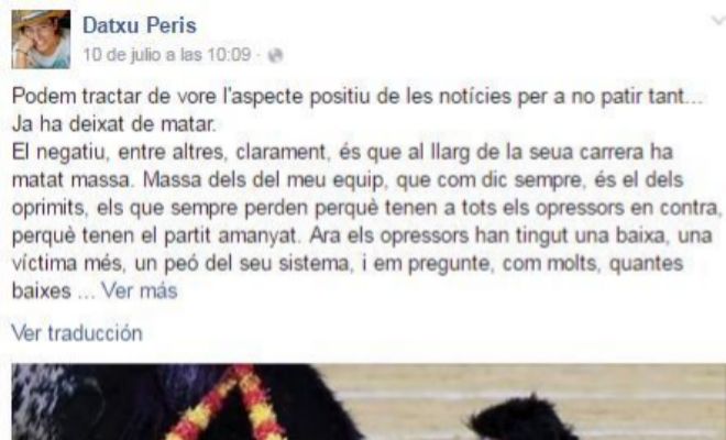 En su perfil de Facebook, Datxu Peris escribió el pasado domingo que no puede sentirlo por "el asesino que ha muerto ahora más que por todos los cadáveres que ha dejado a su paso mientras ha vivido"