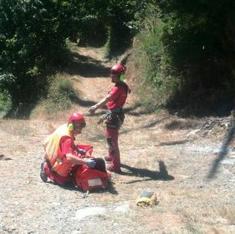 Mientras tanto el médico-rescatador y uno de los bomberos-rescatadores habían accedieron al lugar mediante sendas operaciones con la grúa del helicóptero medicalizado en las que se desplegaron unos 25 metros de cable. El herido se encontraba en una zona arbolada donde no se podía aterrizar. Tras ser estabilizado fue porteado en camilla hasta el punto donde fue recogido también mediante otra operación de grúa con la aeronave medicalizada.