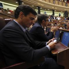 El ejercicio de acrobacia no debió de ser suficientemente brillante para Pedro Sánchez, que ha pasado el 80 por ciento de la intervención de su compañero mirando el móvil y el resto mirando las pinturas del techo de la cámara. No se ha dejado ni una. Técnicamente, Sánchez ha roto la disciplina de aplauso, pues de las cuatro ovaciones que ha dado su partido al sagaz Hernando, se ha ahorrado los cuatro. Solo ha aplaudido al final, lenta, desganada e irónicamente. Los díscolos Susana Sumelzo, César Luena, Margarita Robles y Odón Elorza ni siquiera aplaudieron el final.