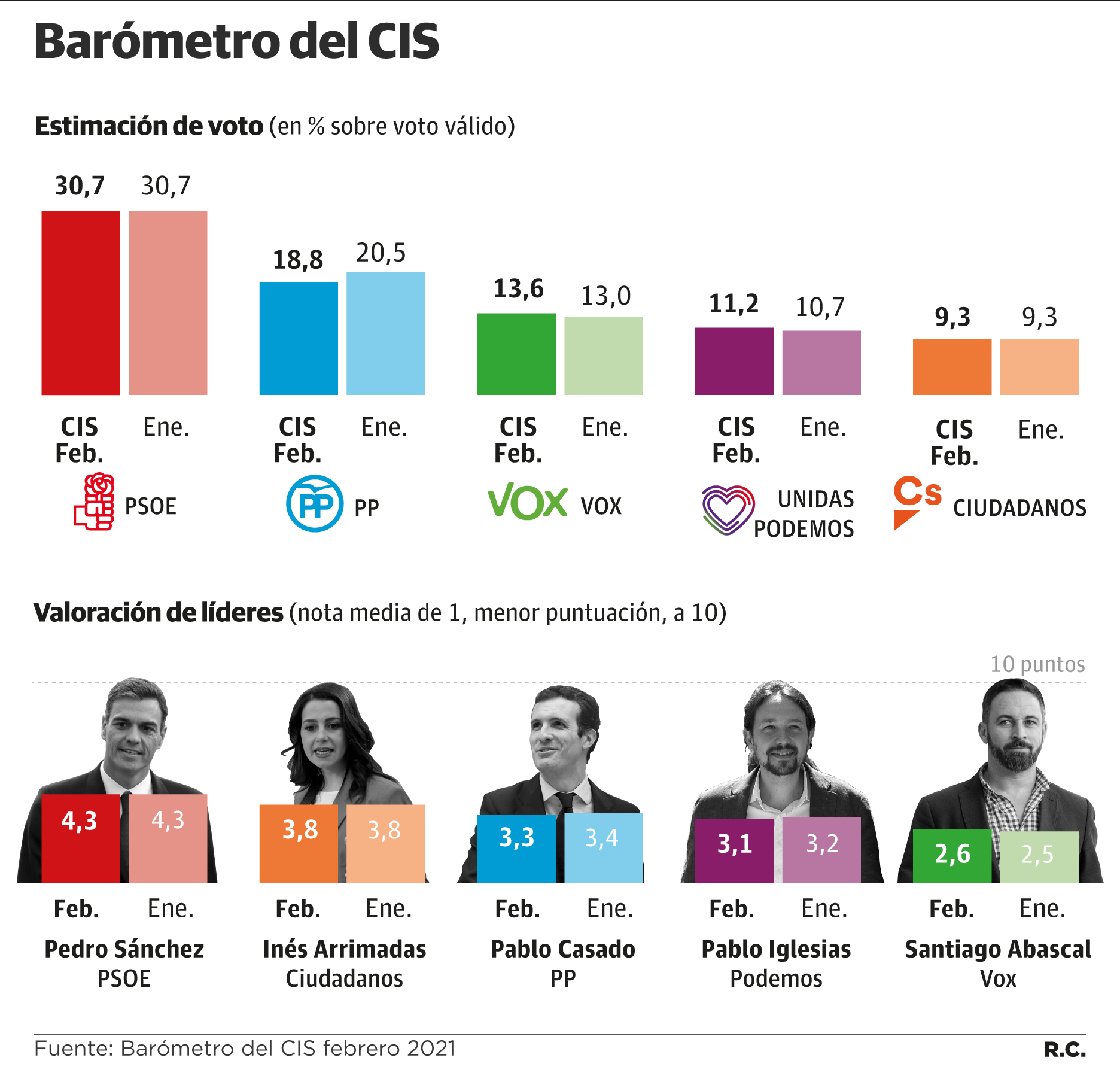 El socio minoritario del Gobierno, Unidas Podemos, registra una leve mejoría en el barómetro del CIS después de meses de malos datos. El partido que lidera Pablo Iglesias tiene una estimación de voto del 11,2%, medio punto más que el mes anterior. Ciudadanos, en cambio, no se mueve. Tuvo unas expectativas de 9,3% en enero y repite en febrero.