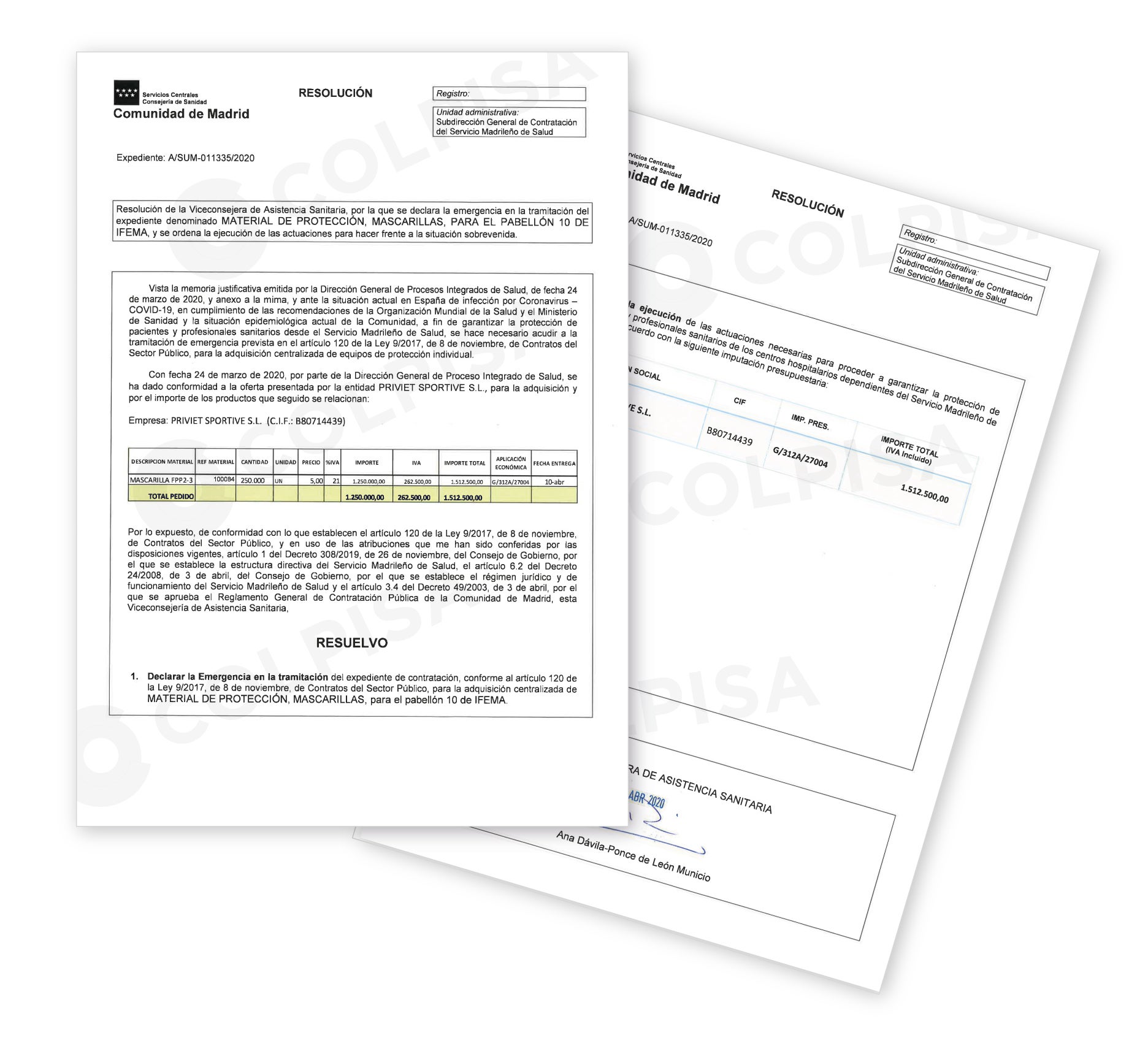 Son apenas dos páginas pero han provocado todo un terremoto político. El contrato por el que el PP supuestamente pretendía investigar al hermano de Ayuso ... se adjudicó sin concurso público y por «trámite de emergencia». La Comunidad de Madrid, el 1 de abril de 2020, en pleno estado de alarma por la crisis sanitaria de covid y en una situación de desabastecimiento mundial de mascarillas, compró 250.000 tapabocas FFP2 y FFP3 a la empresa Priviet Sportive SL.