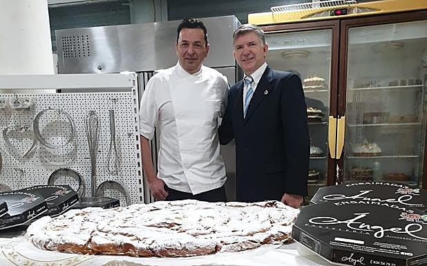 El delegado de la Hermandad Nacional Monárquica de España en Baleares y el pastelero junto a la ensaimada que recibirá el Rey.