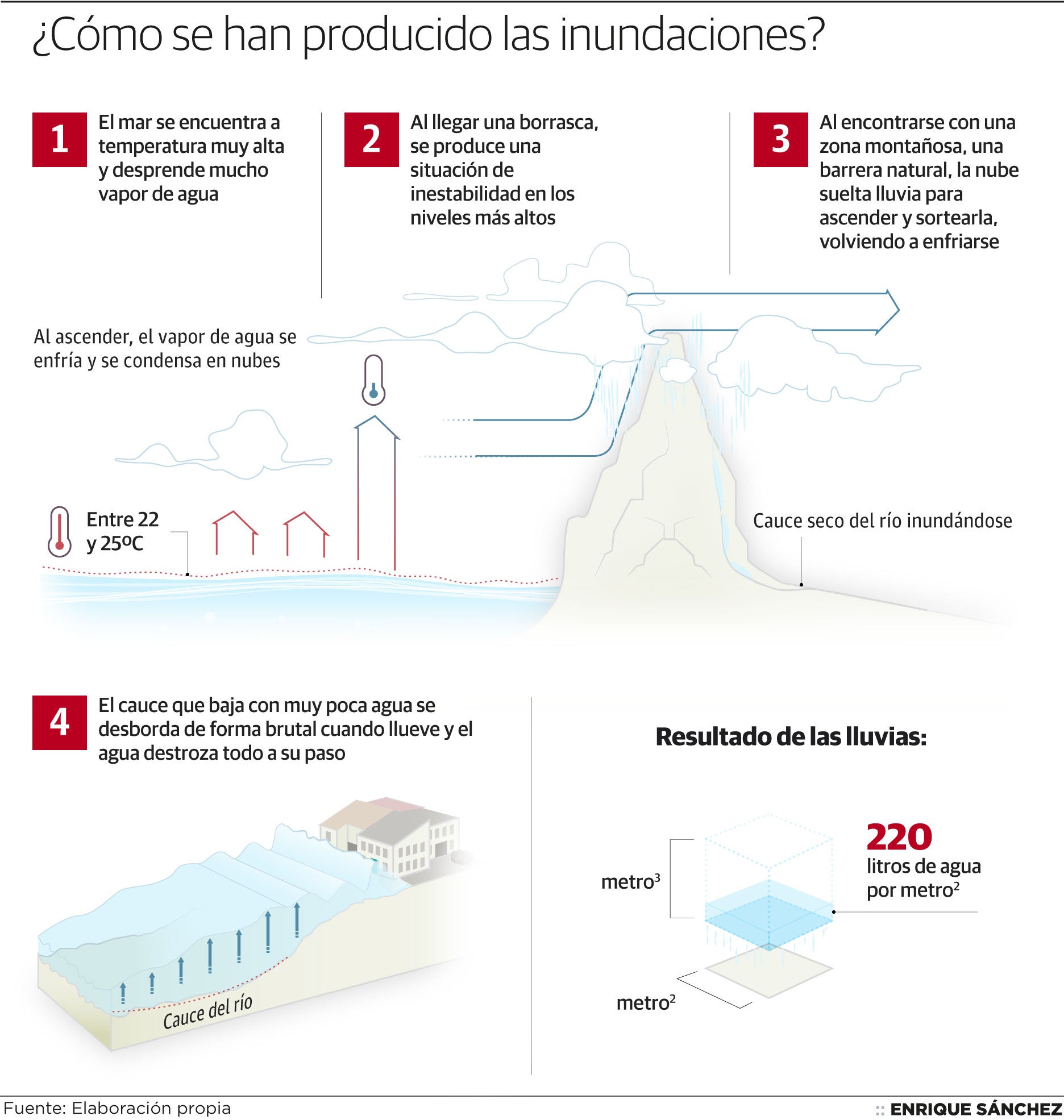 La tragedia azotó a Mallorca ya desde la primera hora de la tarde del martes, cuando la tormenta descargó una fuerte lluvia en Sant Llorenç, el foco de la desgacia. Allí cayeron más de 180 litros por metros cuadrado en poco tiempo y hasta 300 litros al final de la noche. En torno a las 18.00 horas se desbordó el Torrente de Sant Llorenç, habitualmente seco, y el caudal se trasladó hasta el centro del pueblo, que en pocos minutos quedó totalmente anegado.