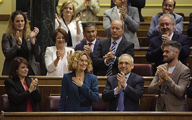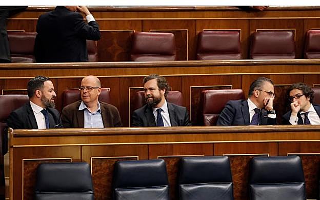 Los nuevos diputados de Vox han llegado al hemiciclo temprano y se han sentado en los escaños que habitualmente ocupa el PSOE. Santiago Abascal, líder de la formación, ha decidido sentarse en el escaño que tradicionalmente ocupa el portavoz del grupo socialista, Adriana Lastra, justo detrás del presidente del Gobierno.