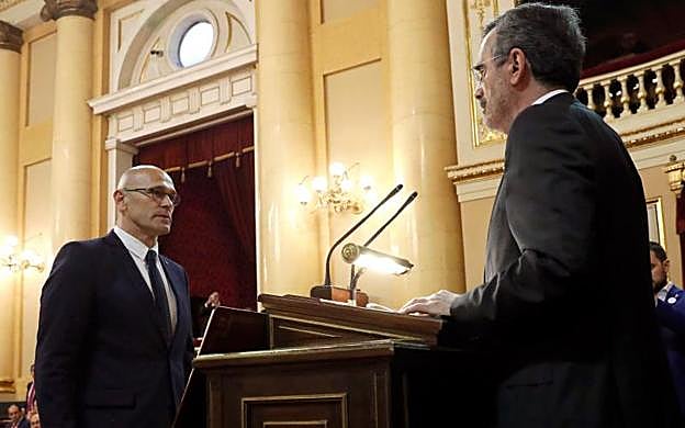Efe «Hasta la proclamación de la República catalana y siempre comprometido con la libertad, igualdad y fraternidad, como preso político y por imperativo legal, prometo», ha reseñado Raül Romeva, que ha modificado ligeramente la fórmula que han usado todos sus compañeros de grupo.