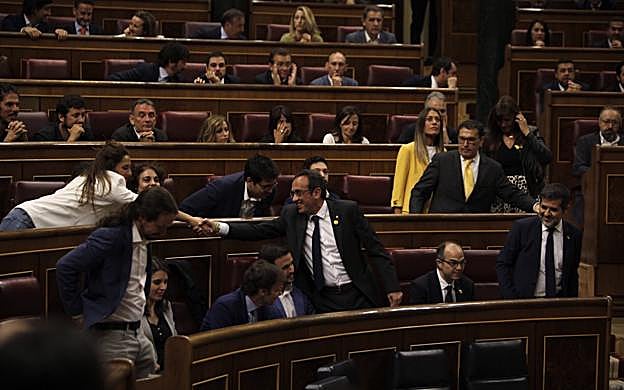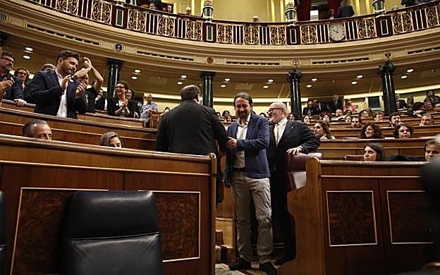 Europa Press Los cuatro diputados en prisión preventiva, Oriol Junqueras, de ERC, y Jordi Sànchez, Jordi Turull y Josep Rull, han entrado en el hemiciclo del Congreso arropados por los aplausos de sus compañeros independentistas y recibiendo el saludo del líder de Podemos, Pablo Iglesias, quien ha hablado brevemente con Oriol Junqueras.