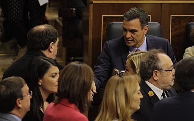 Oriol Junqueras y Pedro Sánchez se saludan protagonizando una de las imágenes del día en una jornada marcada por la presencia de los presos independentistas y la extrema derecha