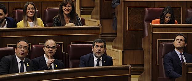 Óscar Chamorro «Es una ofensa al pueblo español que ocupen un escaño y cobren un sueldo público quienes están procesados por dar un golpe a nuestra democracia», ha dicho Albert Rivera, que mira en la imagen hacia arriba ignorando a los diputados independentistas que ocupan sus escaños. La diputada del JxCAT Míriam Nogueras, de amarillo.