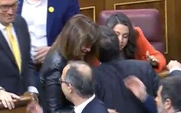 R.C. Albert Rivera no ha saludado a los políticos catalanes presos pese a que han estado cerca en el escaño. Sin embargo, Inés Arrimadas sí ha saludado a Josep Rull y a Jordi Turull, una vez que ellos se han acercado.