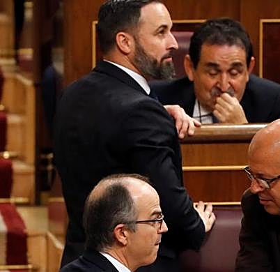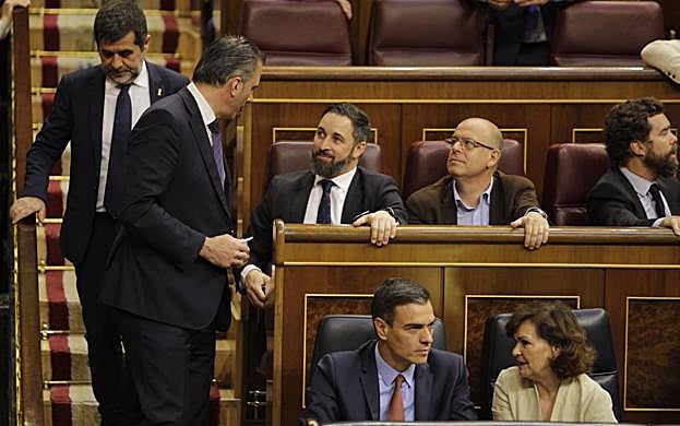 Óscar Chamorro El preso del procés y expresidente de ANC, Jordi Sànchez pasa junto a Javier Ortega Smith (Vox), que dialoga junto a su líder, Santiago Abascal, ante la mirada del diputado del PSC, José Zaragoza. Hoy se encuentran todos juntos como en un cine sin entrada numerada.