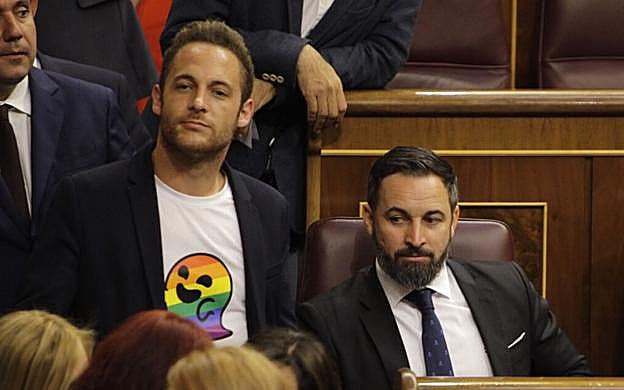 Óscar Chamorro El presidente de VOX, Santiago Abascal, en uno de los escaños del Congreso de los Diputados donde se celebra la sesión constitutiva de las nuevas Cortes Generales. A su lado pasa Arnau Ramírez (PSC) con una camiseta con 'Gaysper', el meme antigay de Vox que ahora es un icono LGTBI.