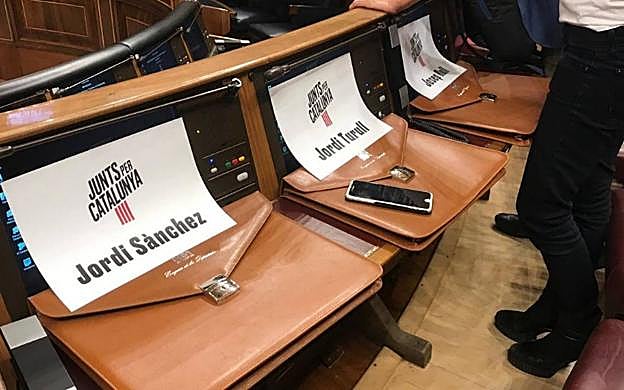 R.C. Unos carteles sirven para guardar el escaño a los políticos presos (Oriol Junqueras, Jordi Sánchez, Josep Rull y Jordi Turull) en la primera línea del hemiciclo.