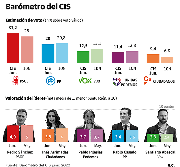 El PSOE no acusa el desgaste por la gestión de la desescalada y mantiene una amplia ventaja sobre el PP, según el último ... barómetro del CIS. Los socialistas conservan el 31,2% de la intención de voto, una décima más respecto al estudio de mayo y 3,2 puntos por encima de su resultado el 10-N. El partido de Pedro Sánchez sigue a once puntos de distancia de los populares, que, por el contrario, pierden tres décimas en el último mes y se quedan en el 20%, sin rentabilizar su estrategia de oposición durante la epidemia. El porcentaje es similar al que obtuvieron el pasado noviembre en las urnas (20,8%).