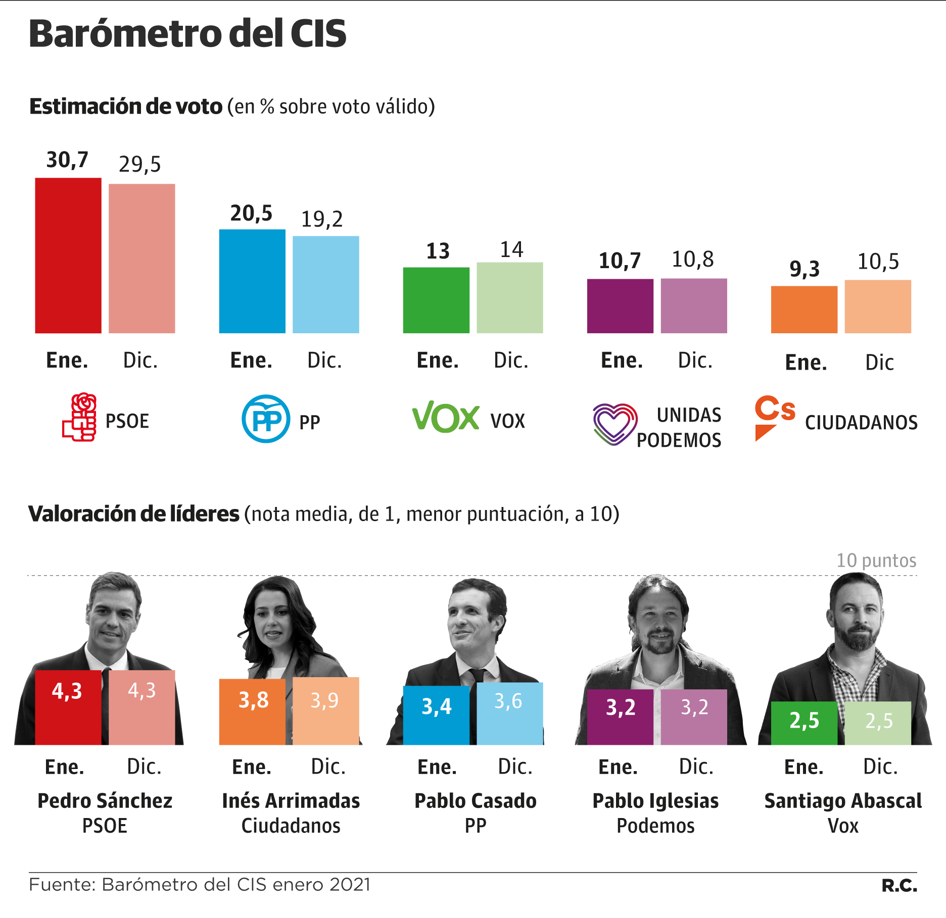 El barómetro del CIS de enero, realizado entre el 7 y 25 de enero, en plena tercera ola de la pandemia, refleja que PSOE y ... PP fortalecerían sus estimaciones de voto si se celebrasen ahora las elecciones generales. Los socialistas obtendrían el 30,7% de los votos y los populares, el 20,5%. Ambos crecen más de un punto respecto al estudio del mes pasado. Una mejoría de las expectativas cimentada a costa de Vox y Ciudadanos, que retroceden casi lo mismo que ganan PSOE y PP.
