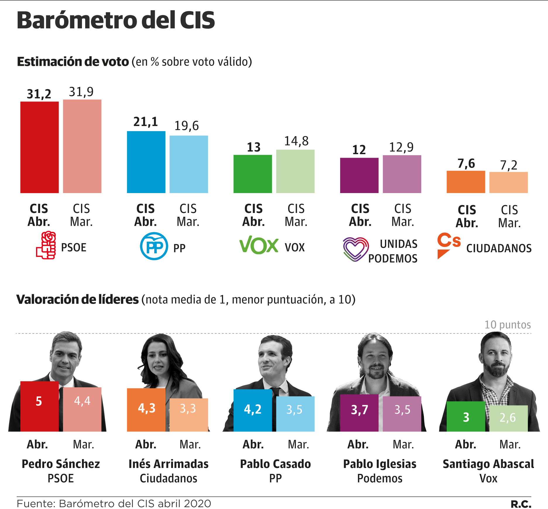 Al PSOE no le pasa factura la crisis del coronavirus, al menos según refleja la encuesta especial por la pandemia del Centro de Investigaciones Sociológicas ( ... CIS), una institución que desde que se hizo cargo de ella el socialista José Félix Tezanos no ha estado exenta de la polémica. Los de Pedro Sánchez ganarían las elecciones con un 31,2% de los votos, siete décimas menos que en el anterior sondeo, pero aún tres puntos por encima de su resultado en las generales de junio.