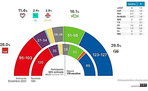 Un sondeo de Metroscopia para el foro Periodismo 2030 concede entre 123 y 127 escaños al Partido Popular, que ganaría las elecciones generales y podría ... sumar mayoría absoluta con Vox (entre 51 y 56 escaños, según el estudio). El PSOE se desinflaría de los 120 diputados actuales a una horquilla de entre 95 y 103 parlamentarios. Las mayores pérdidas de votos socialistas se producirían en Andalucía, Aragón, Castilla-La Mancha, Castilla y León y Comunidad Valenciana. El trabajo, realizado a partir de cinco mil encuestas, establece que la fuga de votos del PSOE al PP ascendería al siete por ciento, cerca de medio millón de papeletas. Los populares también absorberían un trece por ciento del electorado de Vox.
