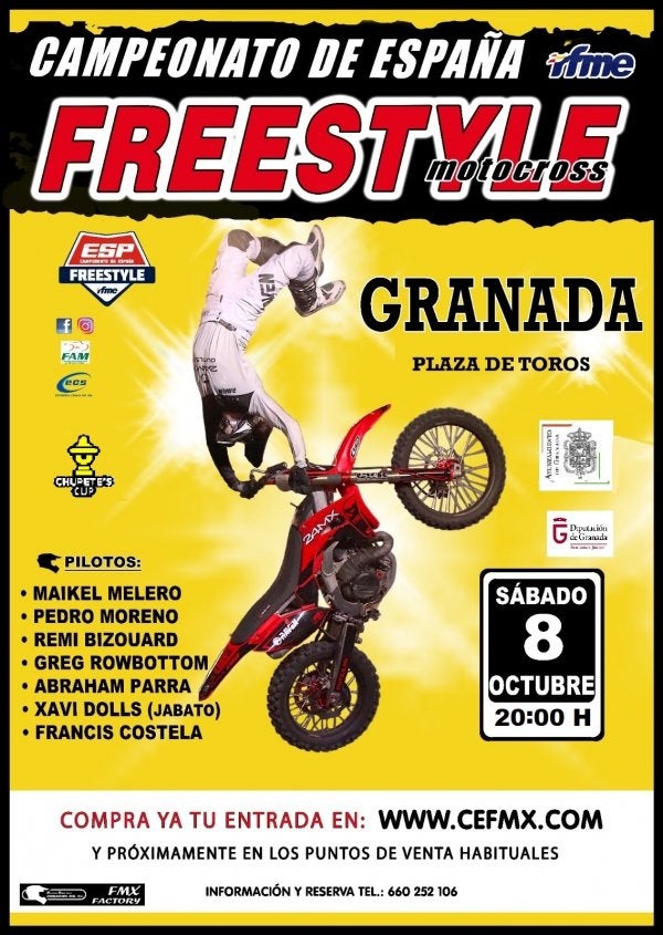 IDEAL Los mejores pilotos del Campeonato de España de Freestyle regresan a Granada con sus saltos de vértigo. Por el título, competirán el cinco veces campeón Maikel Melero, el cuatro veces campeón Pedro Moreno, Remi Bizouard, Greg Rowotton, Abraham Parra o el espectacular Xavi Dolls « Jabato «. | Sábado 8 de octubre | 20:00 horas | Plaza de Toros de Granada | Entradas en Enterticket