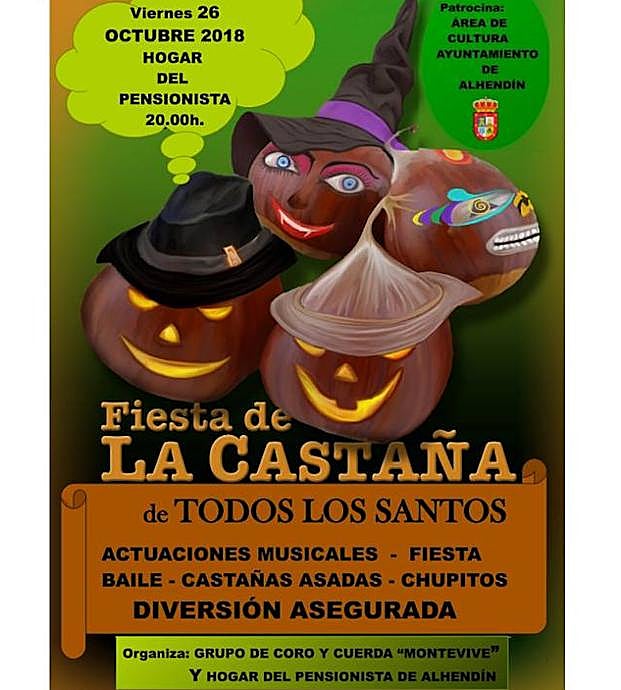 Este viernes 26 de octubre, se celebrará en Alhendín la Fiesta de la Castaña y de Todos los Santos; comenzará a las 20:00 horas, con actuaciones musicales, baile, castañas asadas, chupitos y mucha diversión asegurada.