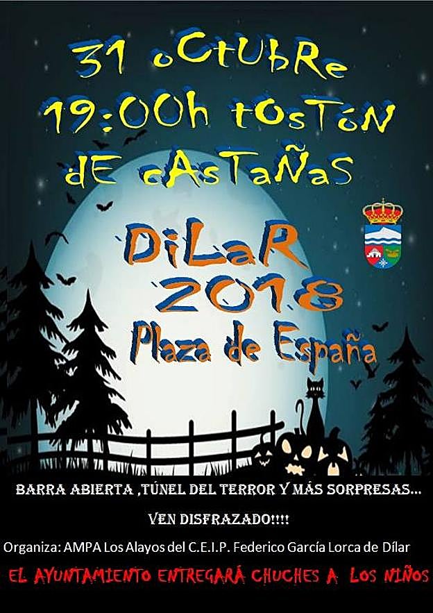 La Fiesta de la Castaña se celebrará el miércoles 31 de octubre en Dílar, a partir de las 19:00 horas; asarán castañas en hogueras de la plaza del pueblo y se repartirán entre los asistentes. La noche del miércoles 31 también habrá actividades de Halloween, un túnel del terror y otras sorpresas. Por otro lado, Dílar ha organizado su VII Encuentro de Magos llamado 'La Castaña Mágica' los días 31 de octubre y 2, 3, y 4 de noviembre, en los que habrá actuaciones, tapeo, hipnotistas y muchas más actividades.