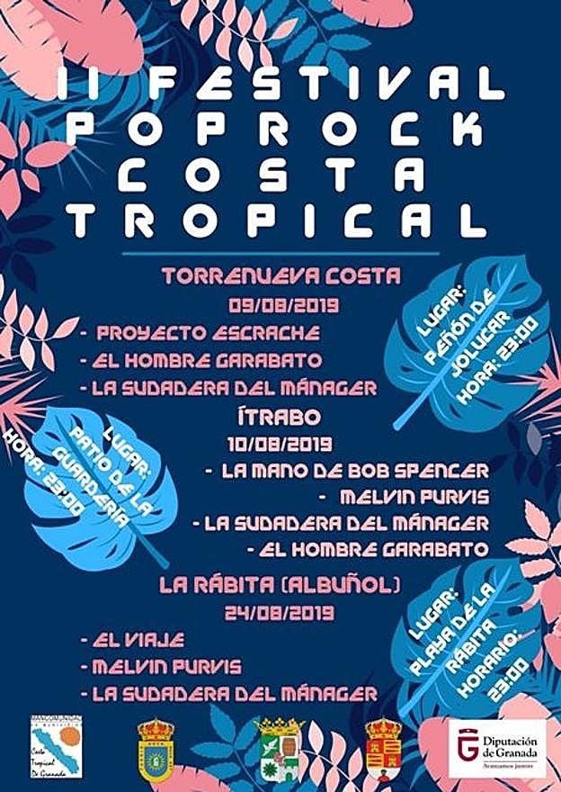 El II Festival Pop Rock en la Costa, organizado por la Mancomunidad de Municipios de la Costa Tropical y Diputación de Granada, se celebra en tres municipios costeros a lo largo del mes de agosto. El primero de los conciertos arranca este viernes 9 de agosto en Torrenueva Costa, el día 10 en Ítrabo y el 24 en Albuñol.