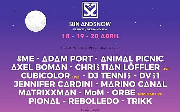 Sun & Snow Festival es la combinación perfecta de aventura, deporte y música, una experiencia única para vivir estos días festivos en el mejor ambiente y en un lugar inmejorable: las cumbres de Sierra Nevada. Durante todo el fin de semana, los visitantes podrán disfrutar de una amplia programación musical con una veintena de actuaciones de bandas emergentes, así como de los grandes nombres del panorama, house, techno, deep-house e independiente del momento. Al tiempo, podrán vivir una divertida jornada de esquí y disfrutar de otras muchas actividades programadas en el marco del Sun & Snow Festival.