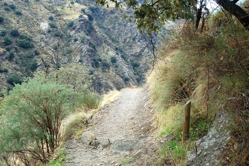 El camino gana altura rápidamente ampliando las vistas del barranco con sus laderas aterrazadas para el cultivo y salpicadas de antiguos cortijos. Hacia el sur se distingue Sierra Lújar (1.870 m), que forma parte de una alineación costera de sierras menores que separan a Sierra Nevada del mar. Hacia el norte, las altas cumbres del macizo.