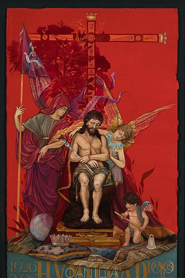 Una pieza ejecutada al óleo sobre tabla y presentado en un marco elegante, despliega una imagen central donde Cristo se sienta majestuosamente sobre su trono de victoria: la Santa Cruz, simbolizada como Árbol de la Vida. A su lado, un ángel ofrece consuelo mientras que una alegoría mariana, representativa de Granada, viste los colores de la bandera local. Esta figura sostiene un estandarte en honor a la Soledad de Nuestra Señora, culminando en la imagen de una granada, símbolo profundamente arraigado en la identidad granadina.