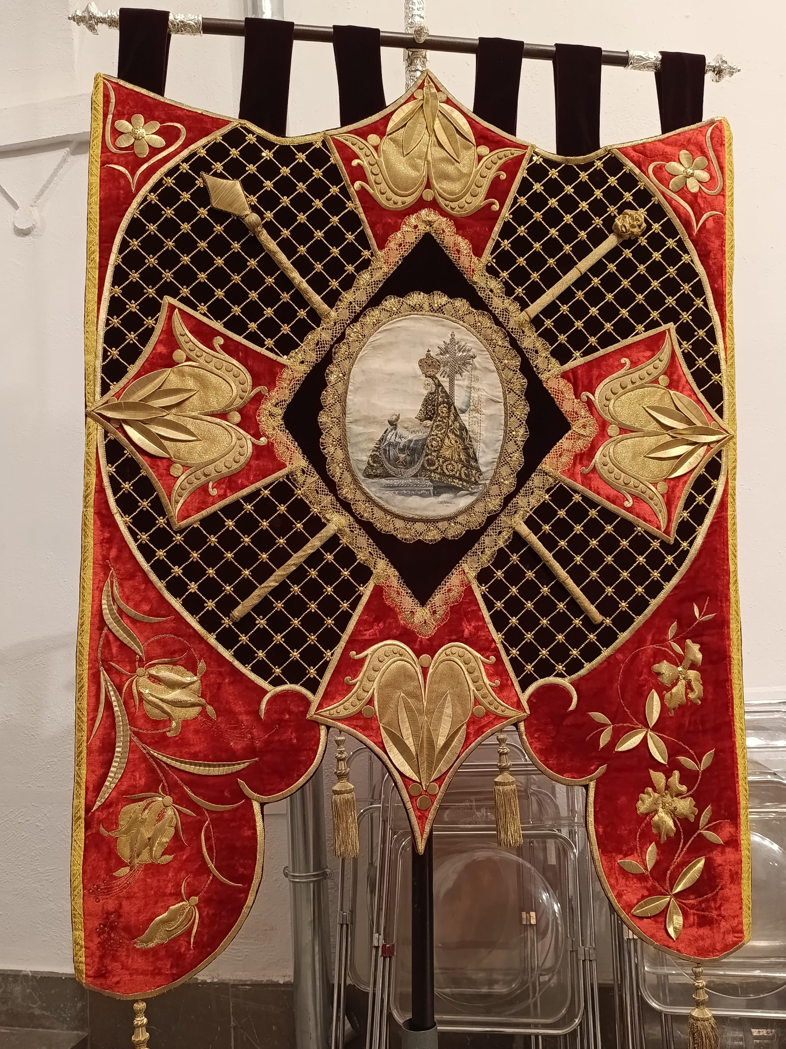 Acto seguido, Manuel Amador explicó los detalles de todas estas piezas junto a los dos bordadores. El estandarte que portarán los palieros pertenece a la Escuela de Cristo, que formaba parte de las realidades pastorales de la Basílica. Estuvo en uso hasta 1953, pero los bordados son de 1919. En su restauración y enriquecimiento se ha conservado el diseño original de forma íntegra con una lanza, la caña y el hisopo como elementos que recuerdan el pasado penitencial de la Hermandad Patronal. Este trabajo se ha realizado en el taller cordobés de Antonio Villar, responsable de las pasadas restauraciones del estandarte de las hermanas cofrades y del guión oficial. La malla calada que lucía el estandarte era de mala calidad y ha tenido que reconstruirse por no poder soportar bien el peso de los terciopelos. Con respecto a este tejido se ha incorporado uno nuevo de color vino tinto en las partes que quedaban al aire y un encaje de hojilla para enmarcar la pintura central de la Virgen.