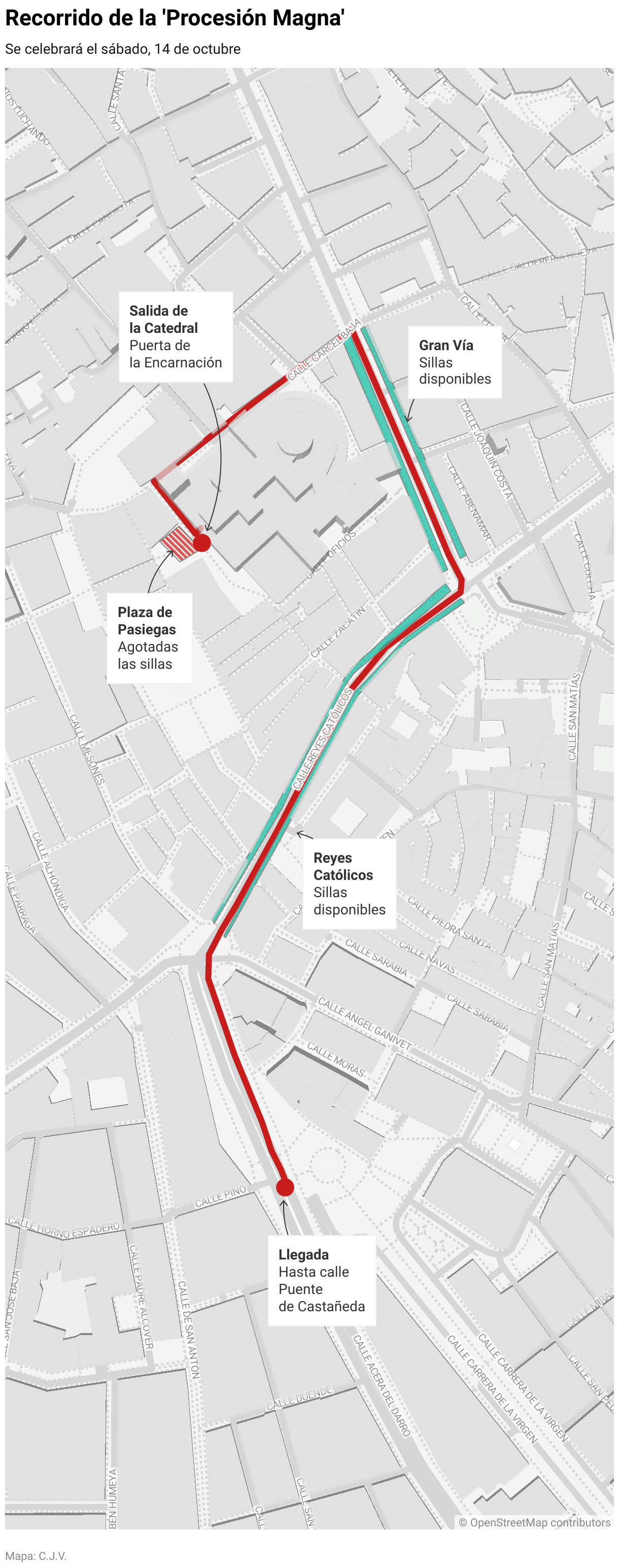 Una preocupación de la Comisión del Encuentro Nacional es que el itinerario pueda albergar al mayor número de personas que lo puedan contemplar en ese sábado de mediados de octubre, uno de los fines de semana de mayor concentración turística en Granada y para el que ya hay numerosas reservas hoteleras. Se quiere que el itinerario acoja entre siete y ocho mil sillas que nunca ocuparían las aceras del recorrido para que pudiera ser presenciada por público. Los asientos se ubicarán en la calzada de las calles del itinerario dejando el espacio de unos tres metros de ancho aproximadamente para el paso del cortejo.